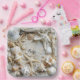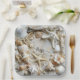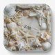 Pretty Starfish, Seashells, driftwood and white pearls on soft white sand paper plates for your seaside, tropical wedding..