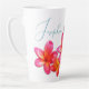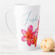 Tall latte mug with pink plumeria flowers and sea stars design. Personalise with a name using blue, modern script font. The tropical flowers and two starfish design wraps around the mug. The name will be on the front for a right-handed drinker. This tall coffee mug is white with realistic pink and orange flowers and brown and white sea life.