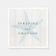 Custom Beach Wedding Cocktail or Dinner Napkins with a light rustic wood background and vintage starfish illustration with personalised names, perfect for a tropical destination wedding or beach theme bridal shower.
