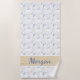 Great vintage images of starfish in sand beige and white, navy blue sea shells and light blue fan coral are set on a white background to make this lovely and sophisticated, light and airy beach themed personalised beach towel, ready to customise with your name or any message of your choice.