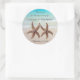 Starfish wedding stickers. Round or square favour labels for a beach wedding. Two realistic sea stars on a turquoise ocean water, and beach sand, background. Customise the thank you message and add names and the wedding date in black script and printed fonts. This set is perfect for any couples getting married on the beach.
