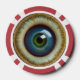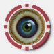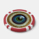 Just the iris and pupil of an eyeball. The iris is formed of three concentric rings, each inset deeper than the last. The outermost is white with yellow-brown striations. The middle is dark blue with white to light blue striations. The green centre is overcome with yellow striations. The pupil is small round and black.
