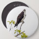 An osprey stands perched on a branch, gazing at the photographer, amidst early spring leaves.