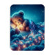 A dreamy and heartwarming illustration of a plush teddy bear resting on a soft pillow amidst fluffy clouds. The bear is cozily wrapped in a glowing, star-filled blanket that flows like a galaxy across the sky. The ambiance is serene, magical, and filled with wonder, perfect for evoking bedtime peace and childhood dreams.