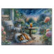 A serene cottage porch scene unfolds beneath a twilight sky filled with drifting stars, where a gentle Sheltie rests among blooming garden flowers. Soft painterly strokes and luminous watercolor tones blend deep blues, mossy greens, blush pinks, and warm amber light, creating a dreamy evening atmosphere. The composition feels nostalgic and peaceful, evoking quiet summer nights, garden paths, and moments of stillness wrapped in nature’s embrace. Whimsical, cozy, and storybook-inspired, this artwork captures the magic of a tranquil cottage garden under the stars. AI generated artwork.