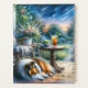 A serene cottage porch scene unfolds beneath a twilight sky filled with drifting stars, where a gentle Sheltie rests among blooming garden flowers. Soft painterly strokes and luminous watercolor tones blend deep blues, mossy greens, blush pinks, and warm amber light, creating a dreamy evening atmosphere. The composition feels nostalgic and peaceful, evoking quiet summer nights, garden paths, and moments of stillness wrapped in nature’s embrace. Whimsical, cozy, and storybook-inspired, this artwork captures the magic of a tranquil cottage garden under the stars. AI generated artwork.