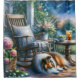 A serene cottage porch scene unfolds beneath a twilight sky filled with drifting stars, where a gentle Sheltie rests among blooming garden flowers. Soft painterly strokes and luminous watercolor tones blend deep blues, mossy greens, blush pinks, and warm amber light, creating a dreamy evening atmosphere. The composition feels nostalgic and peaceful, evoking quiet summer nights, garden paths, and moments of stillness wrapped in nature’s embrace. Whimsical, cozy, and storybook-inspired, this artwork captures the magic of a tranquil cottage garden under the stars. AI generated artwork.