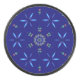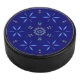 This artwork features a vibrant and symmetrical abstract pattern set against a deep indigo blue background. The design combines floral and geometric elements, with luminous petal-like shapes arranged in radial formations, resembling stylized flowers or starbursts. These petals glow in shades of electric blue with subtle green outlines, creating a dynamic sense of depth and energy. Scattered between the larger motifs are small clusters of iridescent, bubble-like orbs in rainbow hues - red, teal, pink, and green - adding a playful and futuristic touch. At the center of the composition is a kaleidoscopic mandala-like formation made up of these same glowing spheres, anchoring the design and enhancing its hypnotic symmetry.