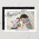 Elegant and modern holiday photo card features your favourite horizontal photo bordered by a thin band of black on a white background, with "Rejoice" in black handwritten style monoline script typography, accented with hand drawn stars in faux gold. Personalise with your custom greeting and name in a mix of italic and block lettering. Card reverses to a snowfall pattern in white on black.NOTE: No gold foil will be printed on this product. This design has a printed effect that uses subtle colour variations to mimic gold foil.