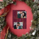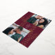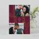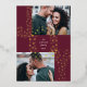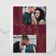 An elegant and unique holiday photo card design featuring two horizontal or landscape orientated photos aligned at the corners, with "JOY" overlaid in starry gold foil lettering on a contrasting dark cranberry plum background. Personalise with your family name and the year in the centre.