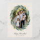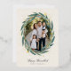 Send Hanukkah greetings to friends and family in chic style with our elegant photo cards. Your favourite vertical or portrait orientated image is framed by an oval laurel wreath of green watercolor eucalyptus leaves on a warm ivory background accented with gold foil stars. Personalise with your custom holiday greeting and names beneath.