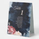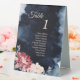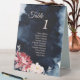 This Starry Night Floral wedding table tent sign with guests inspires either a midnight summer theme or a dark winter of snow theme, making it a seasonally versatile design. The navy blue, almost black, watercolor with a celestial star or snowflake filled sky, combined with the pop of minimal pink flowers and calligraphy is sure to speak to the magic of your marriage celebration, regardless of the time of year.
