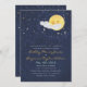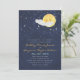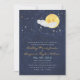 Perfect for a sci-fi loving couple. Two little moon critters adorn this starry night inspired invitation. Shown in shades of navy, light yellow and white with accents of orange and aqua. Back includes room for additional text or a website address.