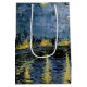 Thatched Cottages at Cordeville. Vincent Willem van Gogh. Night landscape in dark blue and yellow tones. There is a bridge across the river. In the foreground, a man and a woman are walking along the embankment. The stars are shining in the sky.Reproduction of famous works of art images in the public domain.