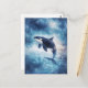 This ethereal postcard features a majestic orca whale breaching gracefully through a dreamlike, celestial atmosphere. The killer whale's body is beautifully rendered with deep indigo and navy watercolor textures, appearing to merge with the vast cosmos. Above, a vibrant teal and indigo galaxy swirl is filled with brilliant shimmering stars and white stardust. The lower half of the scene features a misty blue ocean surface that reflects the light of the nebulae above. The airy, magical lighting and soft-focus textures create a powerful sense of wonder and cosmic beauty. This postcard is an ideal choice for sending an inspirational message, a thoughtful note to a marine life enthusiast, or for use as a piece of dreamy, nature-inspired wall decor.