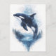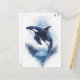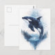 This stunning postcard features a majestic orca whale leaping gracefully against a crisp white background. The whale's body is beautifully rendered with deep indigo watercolor textures and filled with a shimmering galaxy of white stars. Below the orca, a serene landscape emerges from soft blue watercolor splashes, featuring a thick evergreen forest and snow-capped mountain peaks. Tiny birds drift through the airy, mist-filled sky, completing this magical and peaceful nature scene. This postcard is an ideal choice for sending an inspirational message, a thoughtful note to a marine life enthusiast, or for use as a piece of minimalist, nature-inspired wall decor.