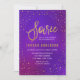 Elegant Birthday invitation featuring a border of stars and the word "Soirée" in faux gold against a purple watercolor background. A versatile birthday invitation that is perfect for any age. Card includes a striped back side. Check out other matching items here https://www.zazzle.com/collections/elegant_starry_purple_watercolor_celebrations-119469232199993091?rf=238364477188679314