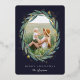 Send holiday greetings to friends and family in chic style with our elegant photo cards. your favourite vertical or portrait orientated image is framed by an oval laurel wreath of green watercolor eucalyptus leaves and gold foil stars on a dark background. Customise with your custom holiday greeting and names beneath in off-white lettering.