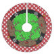 Beautiful Christmas holiday tree skirt features three cute reindeer on a background of red with white stars, a strip of solid black, and an green centre with white polka dots and snowflakes.