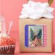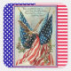 A pretty reproduction of a vintage Fourth of July card, it has been edited to clean the image up, and is on a background of stars and stripes. Put them on cards or give it with a 4th of July gift to add a touch of whimsy. It features a design of a flying eagle and flags on a red, white, and blue background.