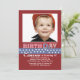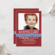 A delightful invitation with a patriotic theme. The bold red background has a blue, star-spangled band and custom "BIRTH DAY" wording. Just add your favourite photo to make it yours! (FP)
