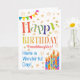 A colourful, text-based Birthday Card for a Granddaughter, with Polka Dot Bunting, bright, striped birthday cake candles and sprinkled with gold-effect stars. The patterned text says, 'Happy Birthday' and there is also 'Have a wonderful day!' in blue lettering (NB the gold effect stars and outlines will be as seen and not be printed in metallic ink.)