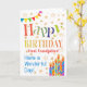 A colourful, text-based Birthday Card for a Great Grandfather, with Polka Dot Bunting, bright, striped birthday cake candles and sprinkled with gold-effect stars. The patterned text says, 'Happy Birthday' and there is also 'Have a wonderful day!' in blue lettering (NB the gold effect stars and outlines will be as seen and not be printed in metallic ink.)