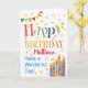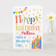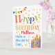 A colourful, text-based Birthday Card for you to customise with the Recipient's name, with Polka Dot Bunting, bright, striped birthday cake candles and sprinkled with gold-effect stars. The patterned text says, 'Happy Birthday' and there is also 'Have a wonderful day!' in blue lettering (NB the gold effect stars and outlines will be as seen and not be printed in metallic ink.)