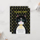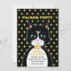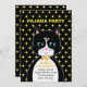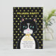 Pajama Birthday party invitation card with a lovely tuxedo cat as a messenger and yellow stars on black background. All text ready to be personalised.