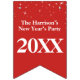 Graphic stylised white stars on red. Elegant New Year bunting ideal for an New Years party or event. Personalise with your own event name and new year date. Uniquely designed by www.mylittleeden.com on zazzle.
