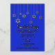 Chic Hanukkah party foil invitation done in royal blue, with graphics of hanging stars of David in silver foil and silver foil custom text. Personalise the custom text, on the front, to suit your holiday party needs.