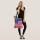 This tote bag is perfect for celebrating the Fourth of July and throughout the summer, shown with a fun patriotic stars and stripes flag print design.