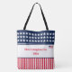 This tote bag is perfect for celebrating the Fourth of July and throughout the summer, shown with a fun patriotic stars and stripes flag print design. Personalise the text to your own.
