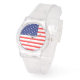 Celebrate your patriotic spirit with our Stars & Stripes Clear Silicone Watch. This stylish timepiece features a clear silicone band and a clear watch face, allowing the bold depiction of the American flag to shine through vividly. The iconic red, white, and blue colours pop against the transparent background, making a statement of American pride with every glance. Crafted for both durability and comfort, this watch is ideal for daily wear. Whether you're at work, out for a run, or attending a casual gathering, its versatile design complements any outfit while showcasing your love for the USA. Perfect for patriots of all ages, this watch combines functionality with a patriotic flair. Embrace the essence of freedom and unity with our Stars & Stripes Clear Silicone Watch, where timeless style meets patriotic passion. Let your wrist tell the story of American pride wherever you go.