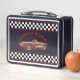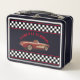 This lunchbox is adorned with a photo of a red Corvette. Above and below the photo there is a black and white chequered accent with red stripes. Lunchboxes are available in 7 colours, including stainless. The text can be customised.