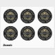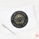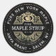 Customise this label with your state name in curved text along the top of this label. Ornate, Elegant Round Black Local Maple Syrup Label with a gold sugar maple leaf. Dashed line border in a muted gold. Your name and location in curved text along lower part of label in white to provide more contrast and readability to this label. Contact info such as email or cell phone in curved text; volume of maple syrup under the words "Pure Maple Syrup" in centre of medallion.