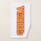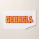 This custom hand towel features a design that displays the word "Georgia" in a Yearbook Solid print font with golden coloured letters red outline in this custom state pride jersey style theme. This towel is made with a polyester blend front while the back is 100% cotton all towels will use sublimation/vibrant printing which is designed to last.