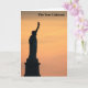 The front of this card has an image of the Statue of Liberty silhouetted against a beautiful orange sky, and the inside has the poem by American poet Emma Lazarus called The New Colossus: Not like the brazen giant of Greek fame, With conquering limbs astride from land to land; Here at our sea-washed, sunset gates shall stand A mighty woman with a torch, whose flame Is the imprisoned lightning, and her name Mother of Exiles. From her beacon-hand Glows world-wide welcome; her mild eyes command The air-bridged harbour that twin cities frame. "Keep, ancient lands, your storied pomp!" cries she With silent lips. "Give me your tired, your poor, Your huddled masses yearning to breathe free, The wretched refuse of your teeming shore. Send these, the homeless, tempest-tost to me, I lift my lamp beside the golden door!" She wrote the poem in 1883 to raise money for the pedestal's construction.