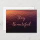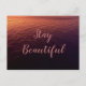 Beautiful motivational postcard with the word "Stay Beautiful" in simple script font and sunset ocean water photograph background.