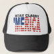 It's the classic, Stay Classy 'merica trucker hat! This funny patriotic hat features the popular original US flag 'MERICA design, and is a perfect hat for the 4th of July, Memorial Day, Veteran's Day, or ANY day of the year! Choose from different colours, and show off your American pride in style.