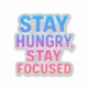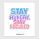 Push limits with this bold “Stay Hungry, Stay Focused” sticker. Perfect for laptops, cars, gym bottles, and notebooks. A trendy motivational quote for hustlers, dreamers, and achievers who never quit.