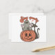 Charming Trio: At the forefront of this postcard, you'll find a super cute ghost perched atop a grinning jack-o' lantern, accompanied by a funny black cat. This trio of Halloween icons is sure to delight and enchant recipients.