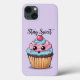 A cupcake with swirls of blue and pink cream, topped with a cherry, radiating sugary charm.