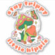 Fun and colourful retro graphic with mushrooms and butterflies. This sticker has the words, "Stay Trippy Little Hippie".