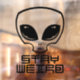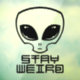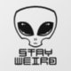 Cartoon alien head illustration with big dark eyes with "Stay Weird" lettering. Keywords: alien, space, martian, cartoon, humour, vector, sci-fi, stay, weird, space