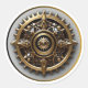 A round sticker with a rusted metal texture and an array of cogs and gears arranged in a circular pattern.