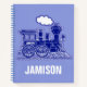 Blue and white steam loco train style notebook. Customise with the name of your choice on both boiler plate and below. Case currently reads: JAMISON. A perfect gift for a train spotter to jot down the trains spotted or a model train enthusiast or railway transport buff . Uniquely designed by Sarah Trett for www.mylittleeden.com