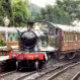 A beautifully restored steam train and carriages of a bygone era arriving at the train station. England UK.