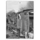 A black and white photographic design of old rusting steam trains awaiting restoration.