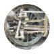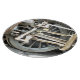 A photographic design of the wheel from a steam train.